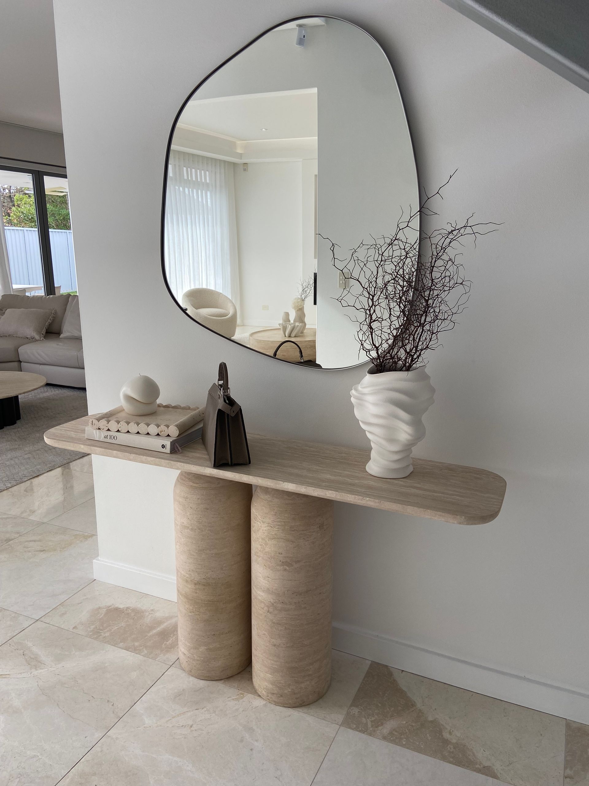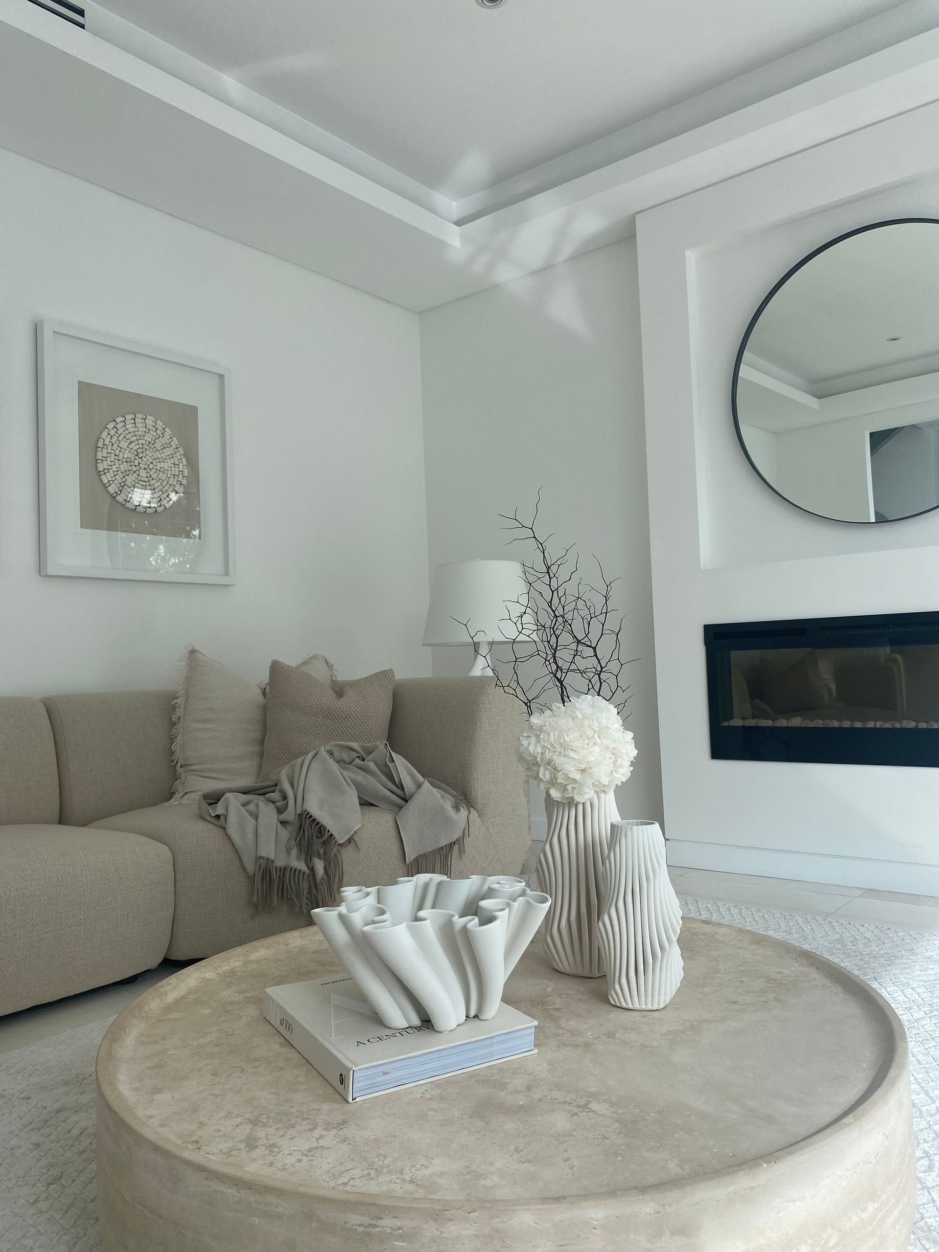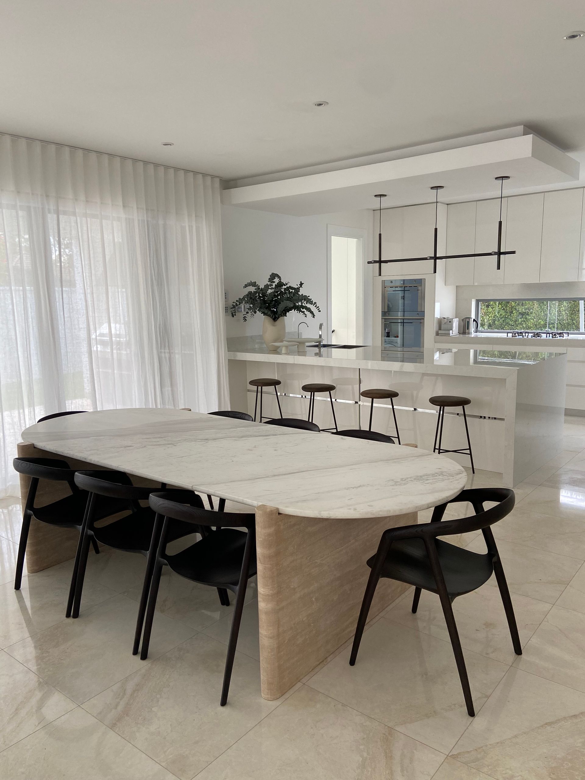 The design palette embraced soft, muted creams and whites, enriched with textural layers and stone accents to create a sophisticated yet inviting atmosphere. Exquisite stone furniture pieces were carefully selected, including a statement foyer hall console, a striking coffee table requiring eight men to install, and a bespoke dining table that demanded six men for placement.