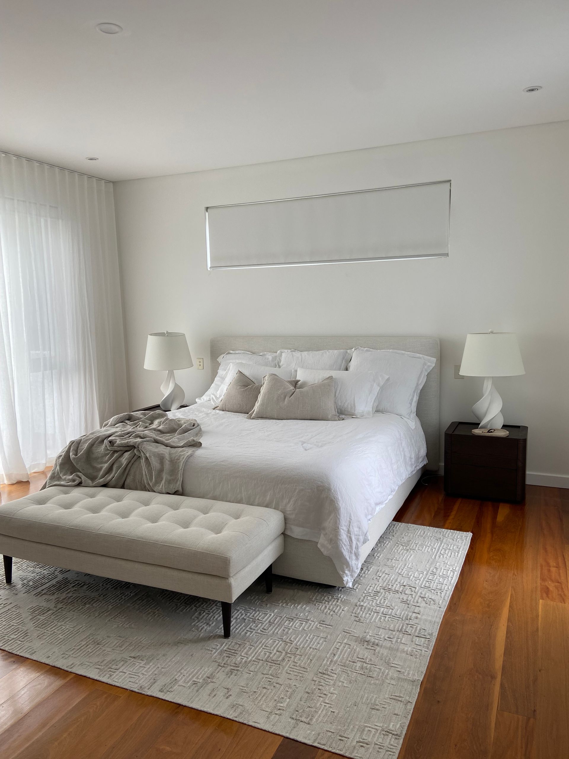 Each space was thoughtfully furnished with high-end pieces, luxurious rugs, and carefully curated artwork to achieve a cohesive, elegant aesthetic. To balance the hard stone surfaces, plush textiles such as rugs, bedding, and cushions were introduced, adding warmth and comfort. Soft linen sheers and roller blinds were chosen to enhance natural light, while three outdated kitchen pendants were replaced with a stunning brass pendant by Nightworks, adding a refined finishing touch.