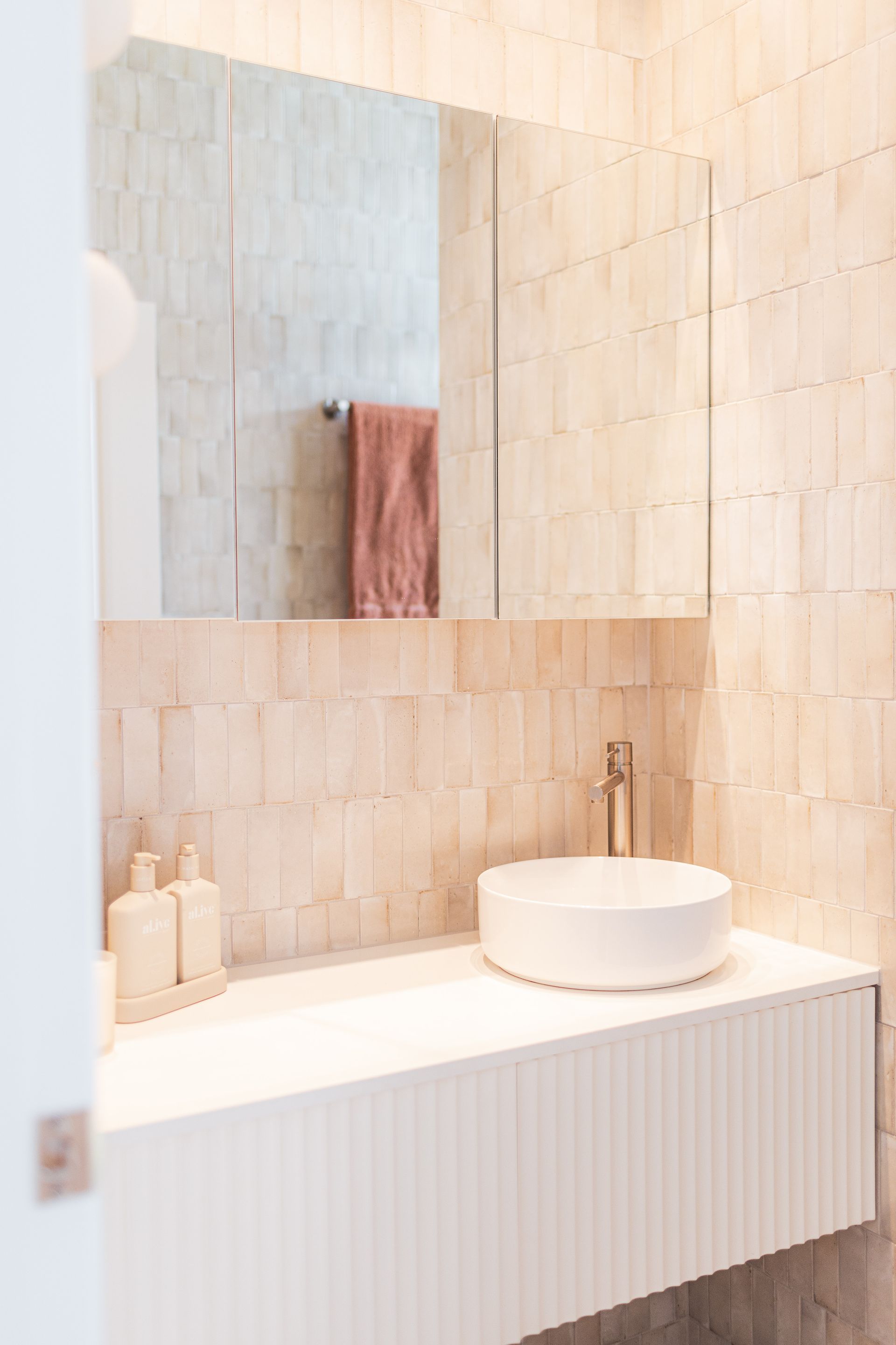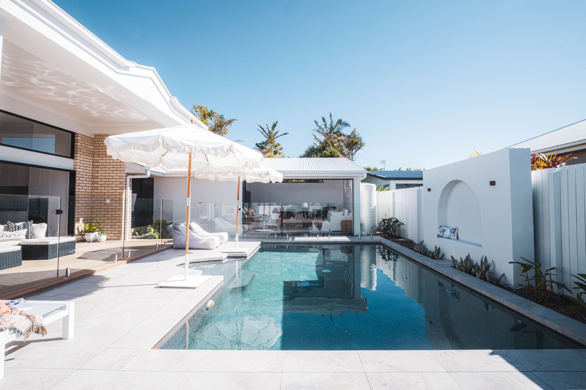 Off the main bedroom, a new larger walk-in robe and en-suite overlooking the garden was also created using terrazzo and handmade look tiles with feature wall sconces to add a bit of "bling". Lastly, the addition of a parents retreat at the back of the house opens out to the pool and backyard which truly encapsulates the tropical environment surrounding this property.